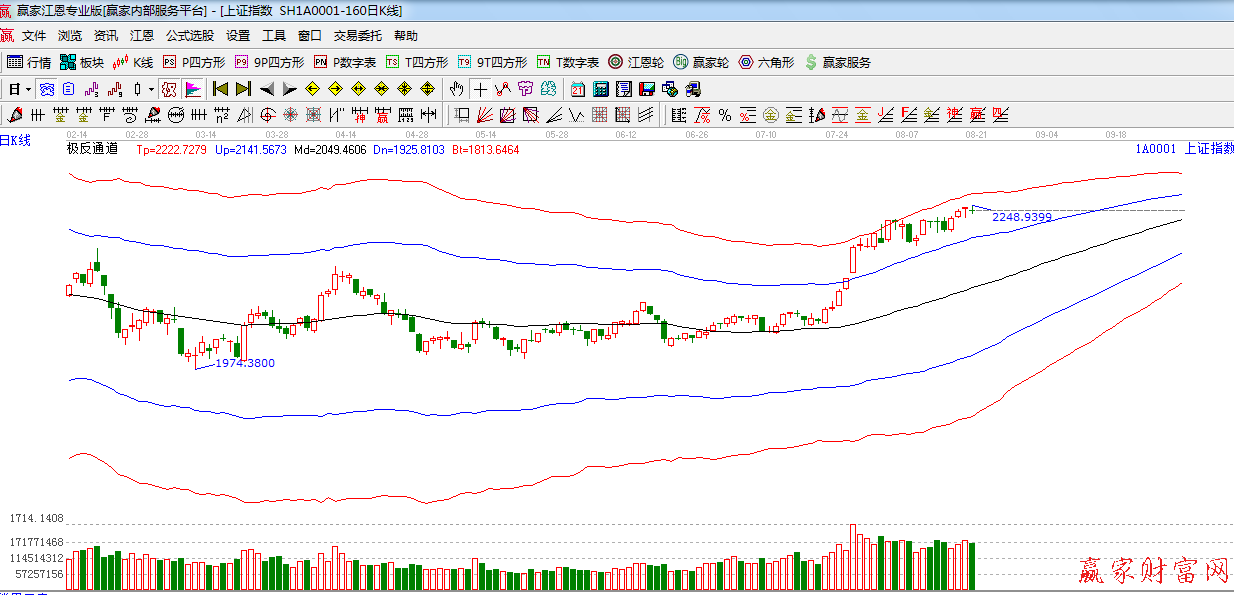 極反通道提示:指數(shù)創(chuàng)出近期新高,十字星報(bào)收,由于距極反通道紅色外軌阻力2260較近,短期謹(jǐn)慎為主。