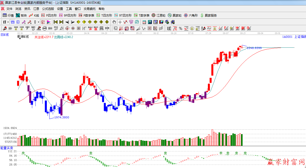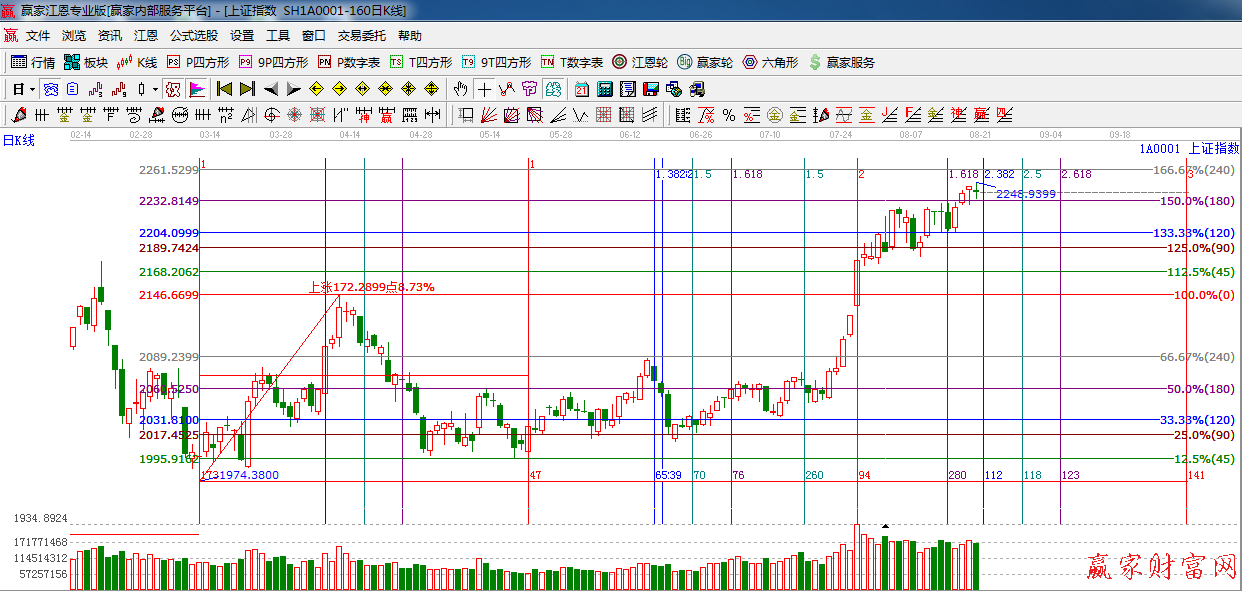 ★依據(jù)贏家江恩系統(tǒng)波段百分比提示:盤中回踩180度支撐線2232點(diǎn),上方阻力 225度是2254點(diǎn),240度2261點(diǎn)。