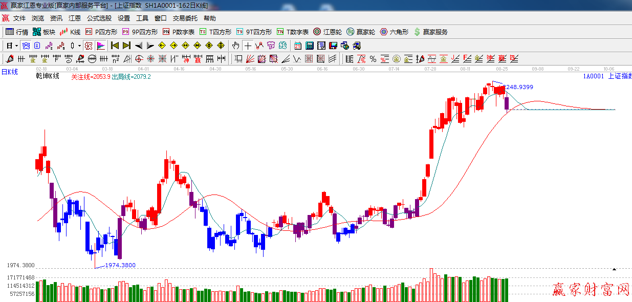 ★依據(jù)贏家江恩系統(tǒng)乾坤K線提示:盤中破位出局線,k線轉(zhuǎn)入紫色警示,短線看空,紅色關(guān)注線決定波段。