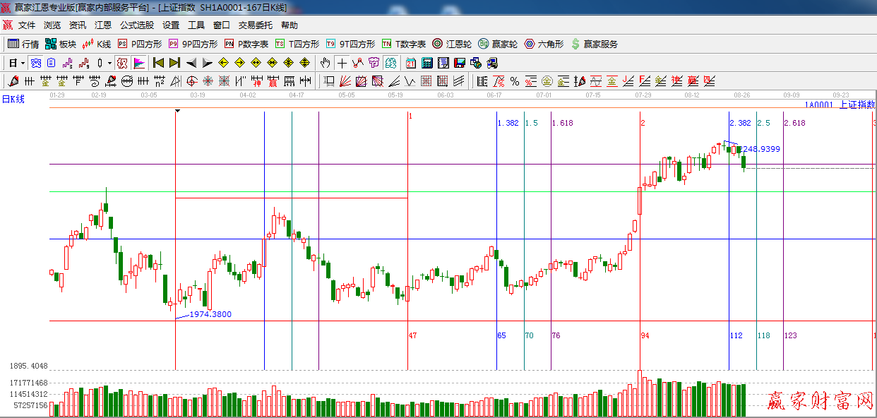 ☆依據(jù)贏家江恩系統(tǒng)波段百分比提示:破位江恩六角形90度角度線2210一線,明日如不能收復(fù),將去2170點(diǎn)尋求支撐。