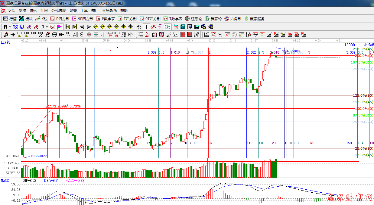 江恩看盤綜述:依據(jù)贏家江恩技術(shù)工具分析得出:周四指數(shù)再次觸摸外軌線,隨后出現(xiàn)跳水,終盤以長上影線的放量十字星報(bào)收,預(yù)示短期將展開震蕩修復(fù)走勢,操作上,可考慮逐步撤離本輪反彈漲幅過大的個(gè)股。