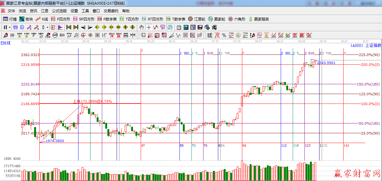 ☆依據(jù)贏家江恩系統(tǒng)黃金時(shí)間周期線提示:下一時(shí)間窗口是9月18日,9月25日。