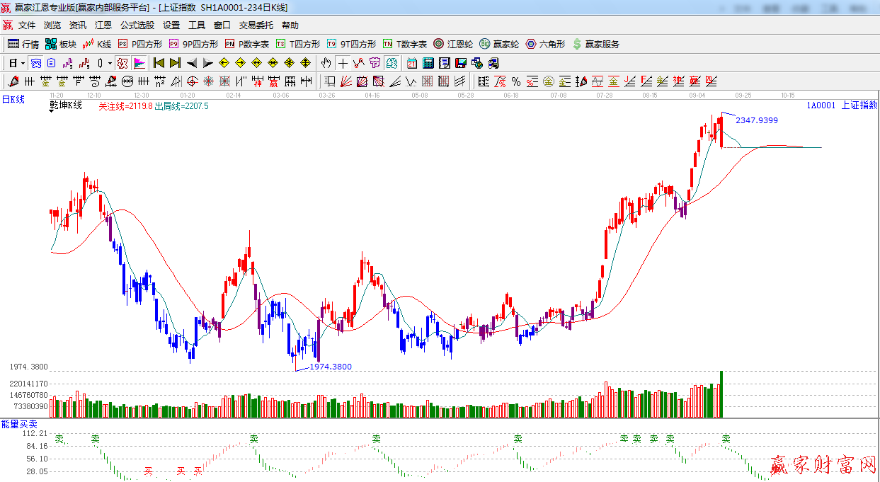 ☆依據(jù)贏家江恩系統(tǒng)能量買賣提示:昨天寫到出現(xiàn)多空臨界點,看多能量柱有背離跡象,今日賣出現(xiàn),謹,短線看空。