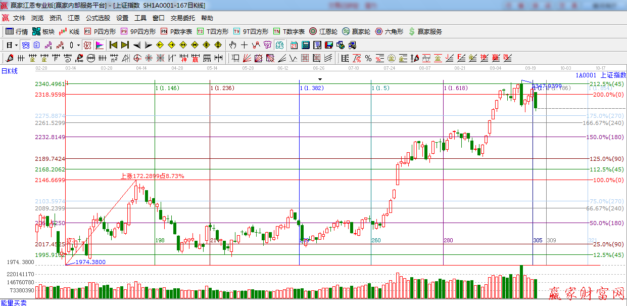 ★依據(jù)贏家江恩系統(tǒng)波段百分比提示:跌破0度2019點,明日將要面臨的是270度位置2275點支撐,240度2261點,上方阻力是2340點。