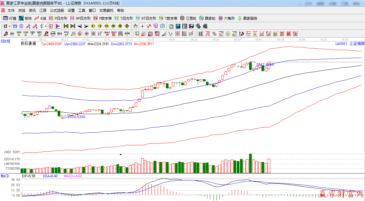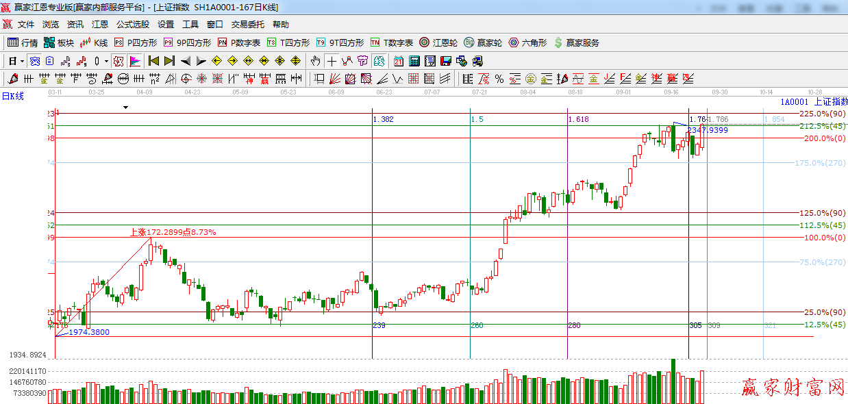 ★依據(jù)贏家江恩系統(tǒng)波段百分比提示:放量突破,0度,45度阻力線,短期阻力位 是2330-2340點,上方面臨阻力位90度,2362點。