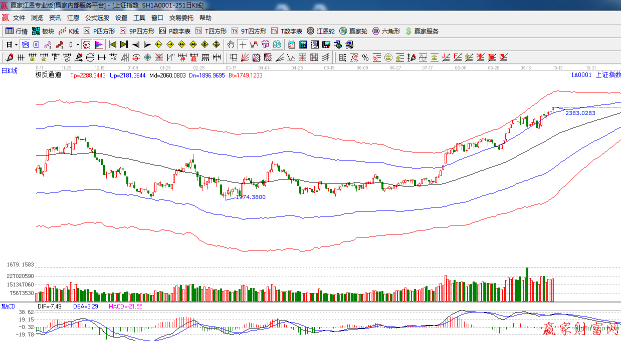 極反通道提示:極反通道外軌線之上震蕩上行, 線上支撐,線下壓力,支撐此位置不破,短線看多。