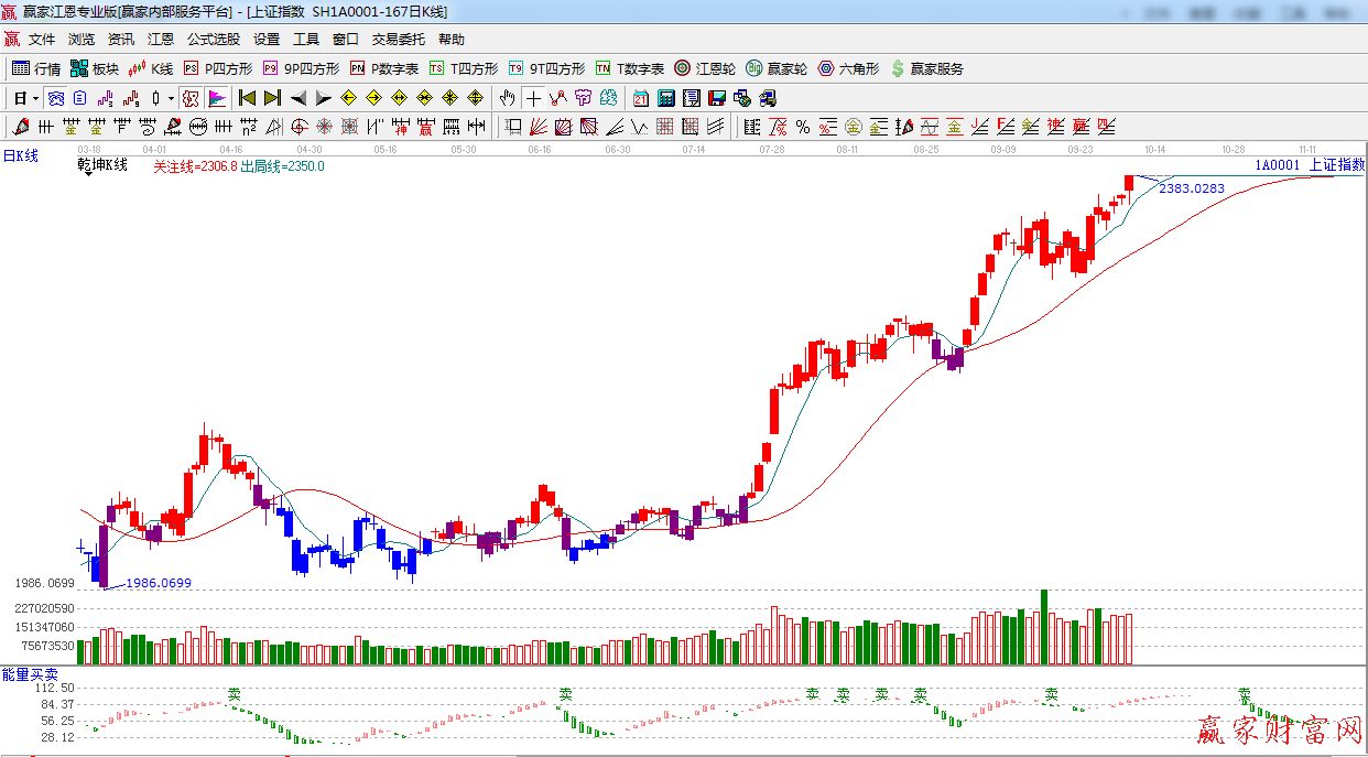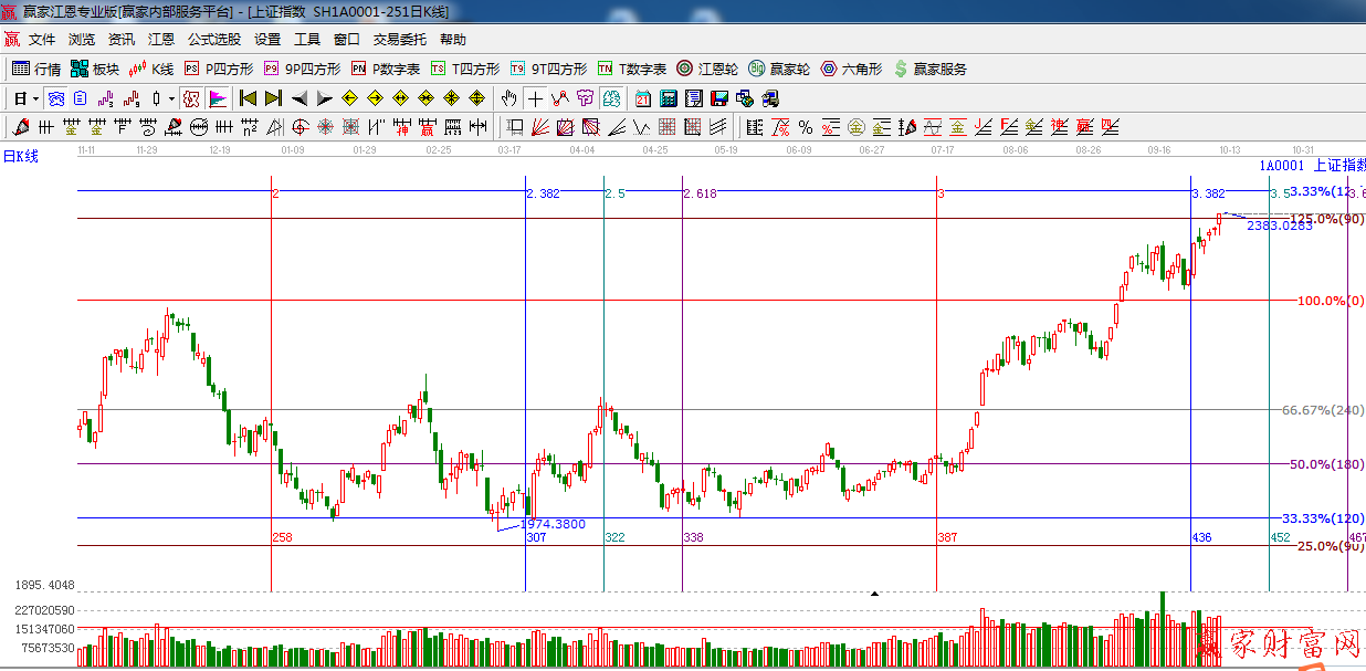 ★依據(jù)贏家江恩系統(tǒng)波段百分比提示:作圖1849點(diǎn)-2270點(diǎn)做延伸線,今日突破90度2376點(diǎn)阻力,依據(jù)規(guī)則阻力轉(zhuǎn)換支撐,短期上方阻力位是120度2411附近,