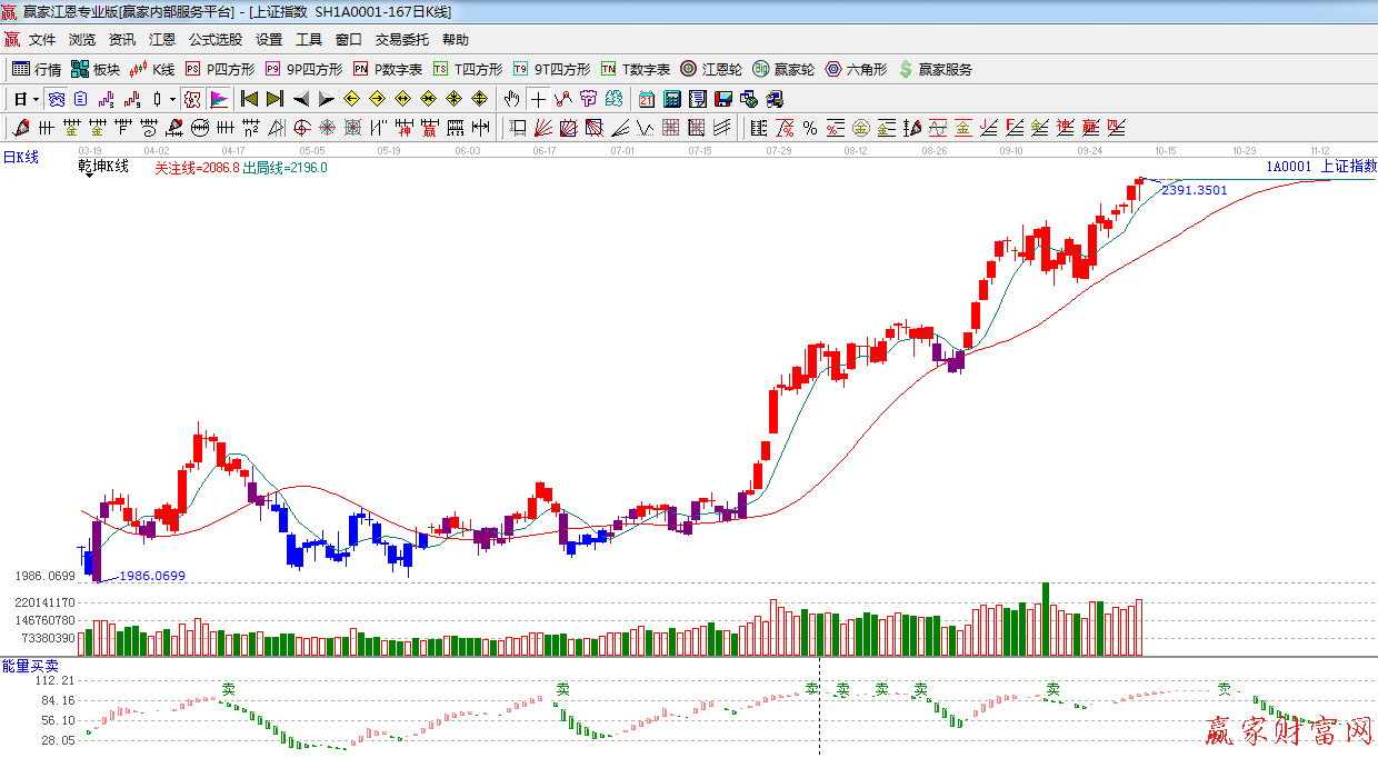 ☆依據(jù)贏家江恩系統(tǒng)能量買賣提示:紅色能量柱,與之前出現(xiàn)背離跡象,謹慎看多