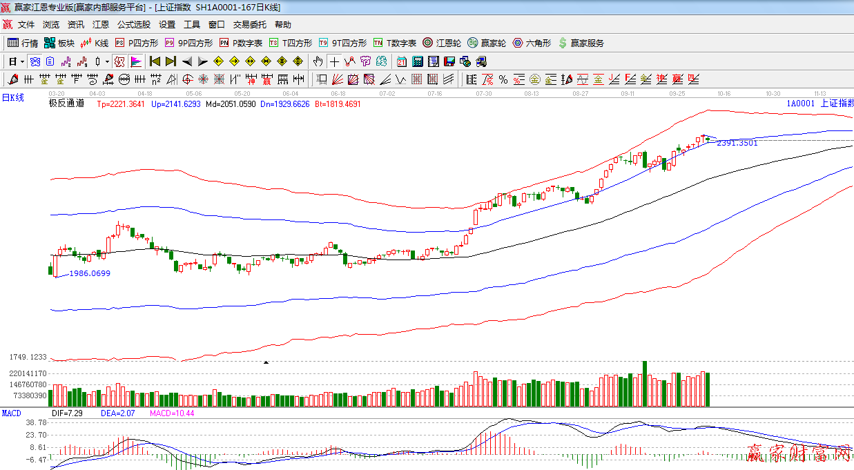 江恩看盤綜述:依據(jù)贏家江恩技術(shù)工具分析得出:今日指數(shù)圍繞外軌線震蕩,終盤以陰十字星報收,近期指數(shù)高位滯漲以及盤中震蕩加劇,而且macd有高位背離的走勢,,下周重點關注日線藍色外軌線的得失,此位置一旦破位,預計市場會出現(xiàn)幾天的日線級別調(diào)整,但以中線而言,短線的調(diào)整并不改變反彈趨勢,目前操作策略上做好倉位的調(diào)整保持3-5成左右。