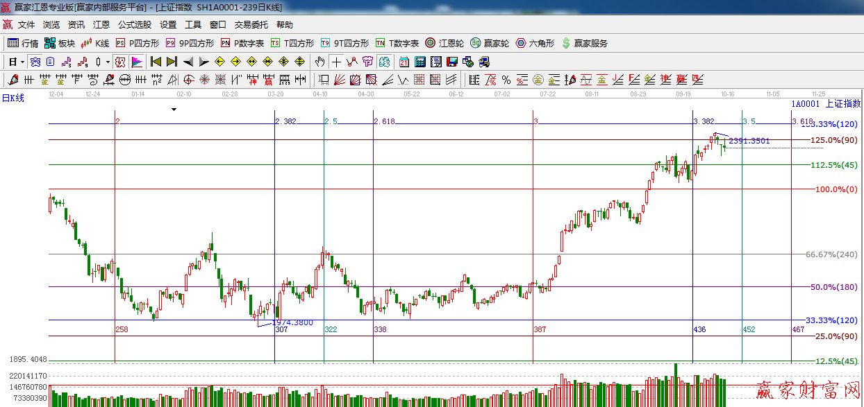 江恩看盤綜述:依據(jù)贏家江恩技術(shù)工具分析得出:今日指數(shù)反抽外軌線未果,終盤陰十字星報(bào)收,短周期60分鐘生命線2345點(diǎn)附近將面臨重大考驗(yàn),此位置的得失,決定短期運(yùn)動方向,意思是,此位置如破位近期頭部確立,如不破位,指數(shù)短期震蕩整理之后還會向上,操作上,降低倉位,耐心等待新操作機(jī)會的形成。