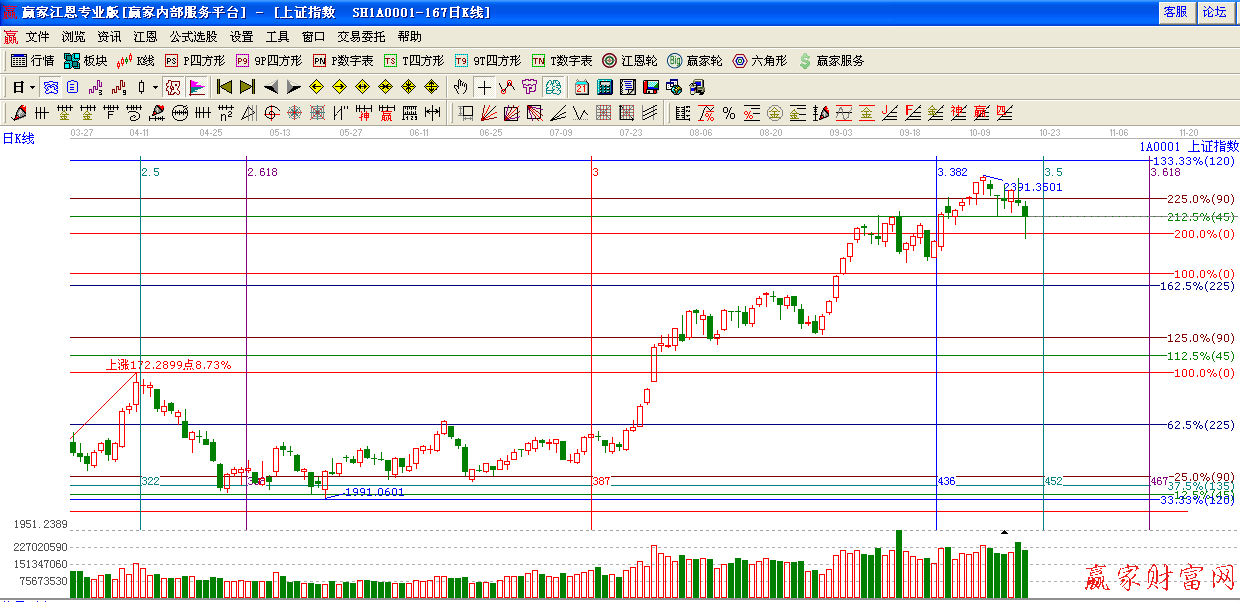 ☆依據贏家江恩系統(tǒng)黃金時間周期線提示:10月9日以及寒露時間節(jié)點之后,指數如期展開回落,下一時間窗口10月22日。