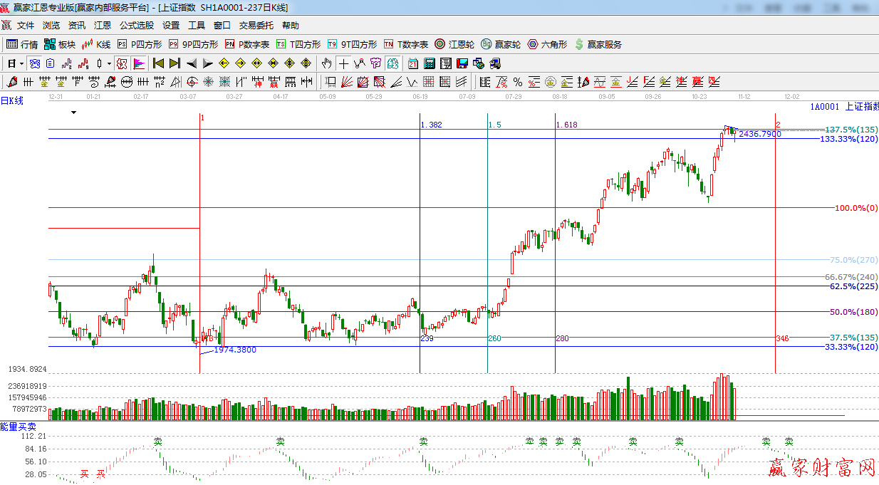 ☆依據(jù)贏家江恩系統(tǒng)波段百分比提示:盤中破位120度2410點(diǎn),尾盤收回,明日下方支撐依然是120度2410點(diǎn),上方阻力135度2428點(diǎn),180度是2480點(diǎn)。