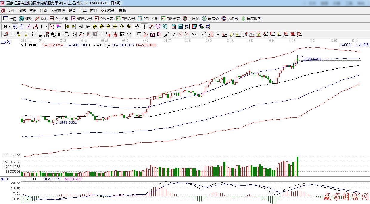 極反通道提示:高位放量十字星,回踩藍(lán)色外軌線,外軌支撐2458點,短期謹(jǐn)慎看多。