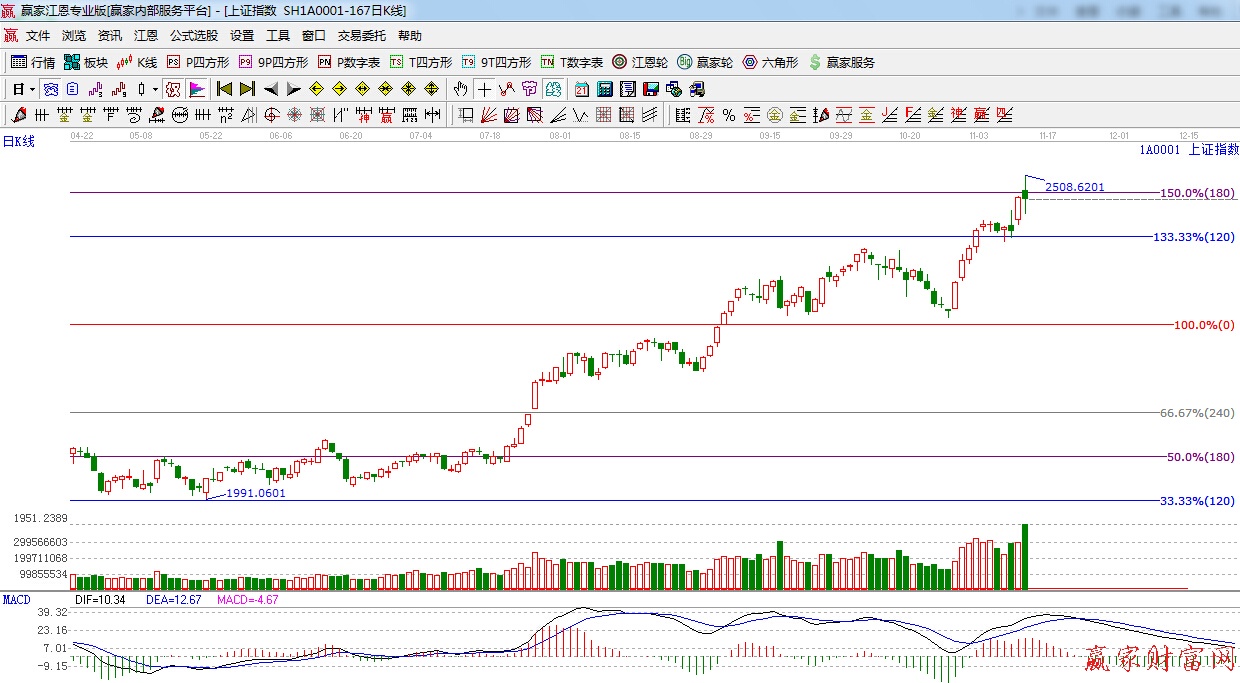 周二早盤延續(xù)昨日強(qiáng)勢,在銀行,券商的帶領(lǐng)下突破2500點,午后開盤開始跳水,終盤以十字星報收,成交量突破5800億元,創(chuàng)歷史成交紀(jì)錄。