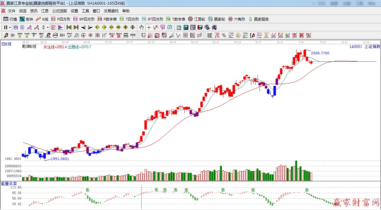 ★依據(jù)贏家江恩系統(tǒng)乾坤K線提示:紅色區(qū)域,短線出局線之下,短線看空。