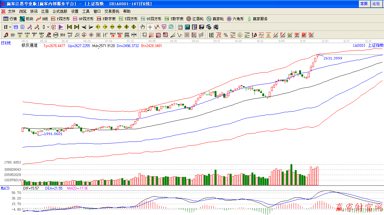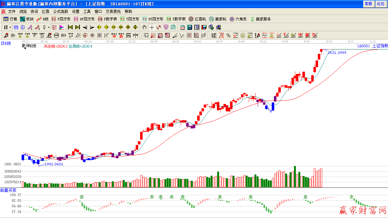 周四,滬深兩市繼續(xù)保持逼空上行態(tài)勢,創(chuàng)出年內(nèi)新高,到達極反通道紅色外軌阻力線,上證大漲26.14點,以2630.49點報收,同時,兩市成交量合計達6184.8億元,再創(chuàng)天量。