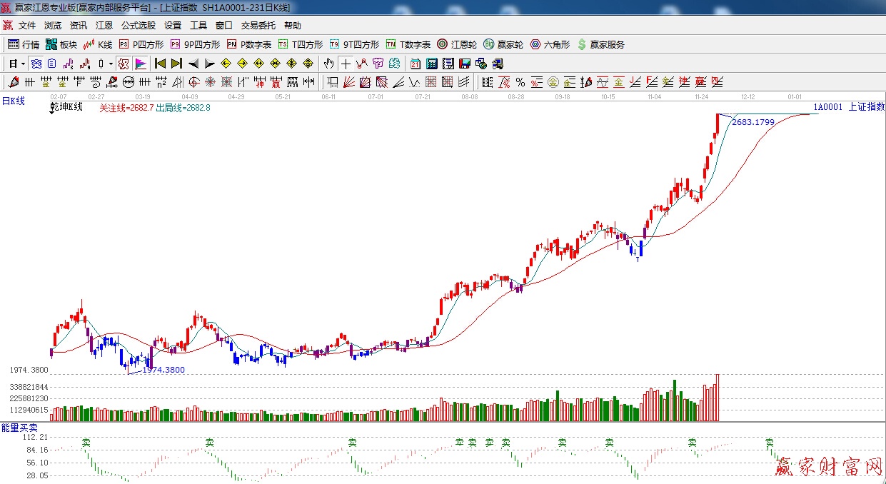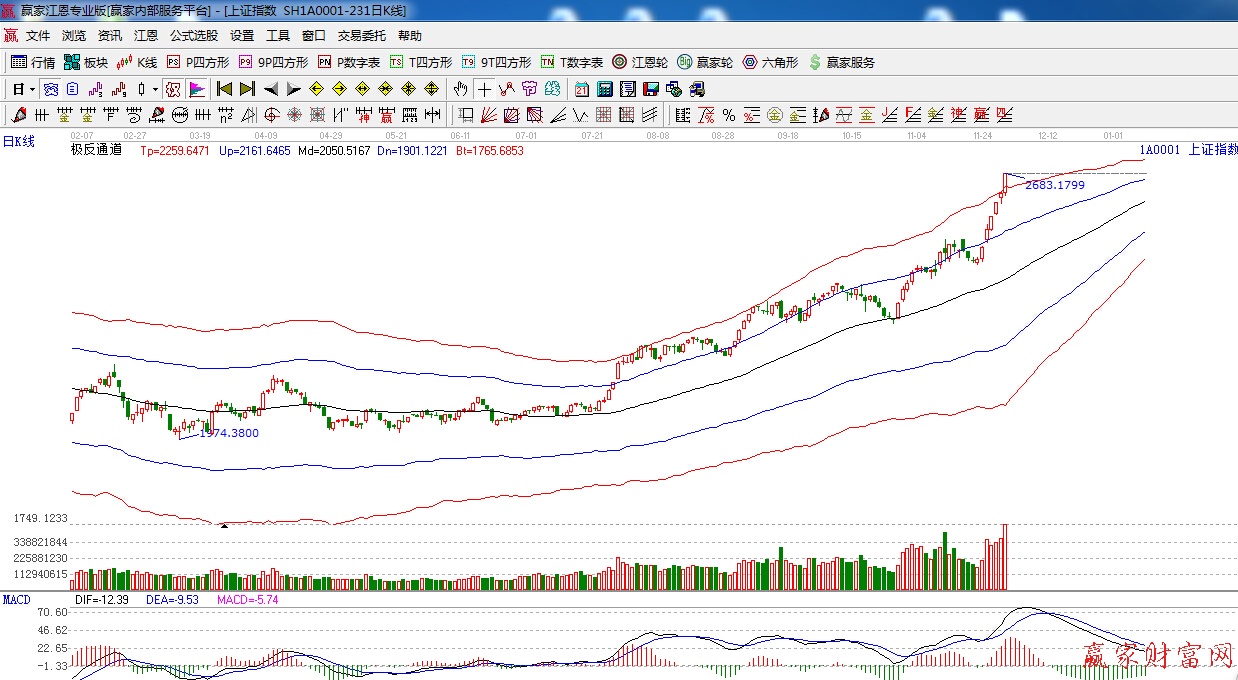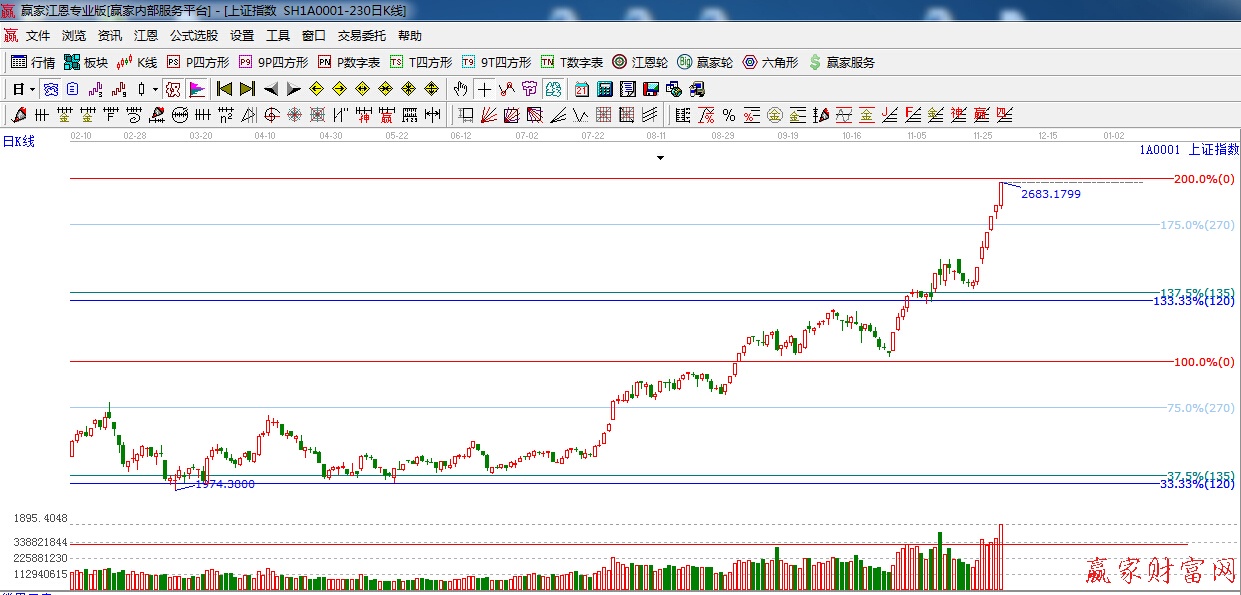 江恩看盤綜述:依據(jù)贏家江恩技術(shù)工具分析得出:銀行接力券商引領(lǐng)大盤強(qiáng)勢上攻,運(yùn)行至極反通道紅色外軌線,此時應(yīng)多加謹(jǐn)慎,隨時注意回調(diào)風(fēng)險,另外價格分析200%位置2690點(diǎn),是本周需要注意的點(diǎn)位,預(yù)計(jì)本周指數(shù)整體以高位震蕩為主。