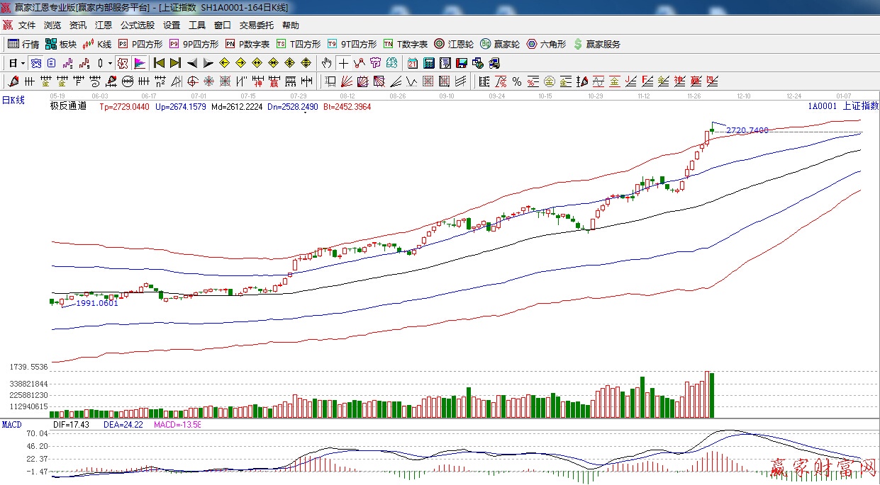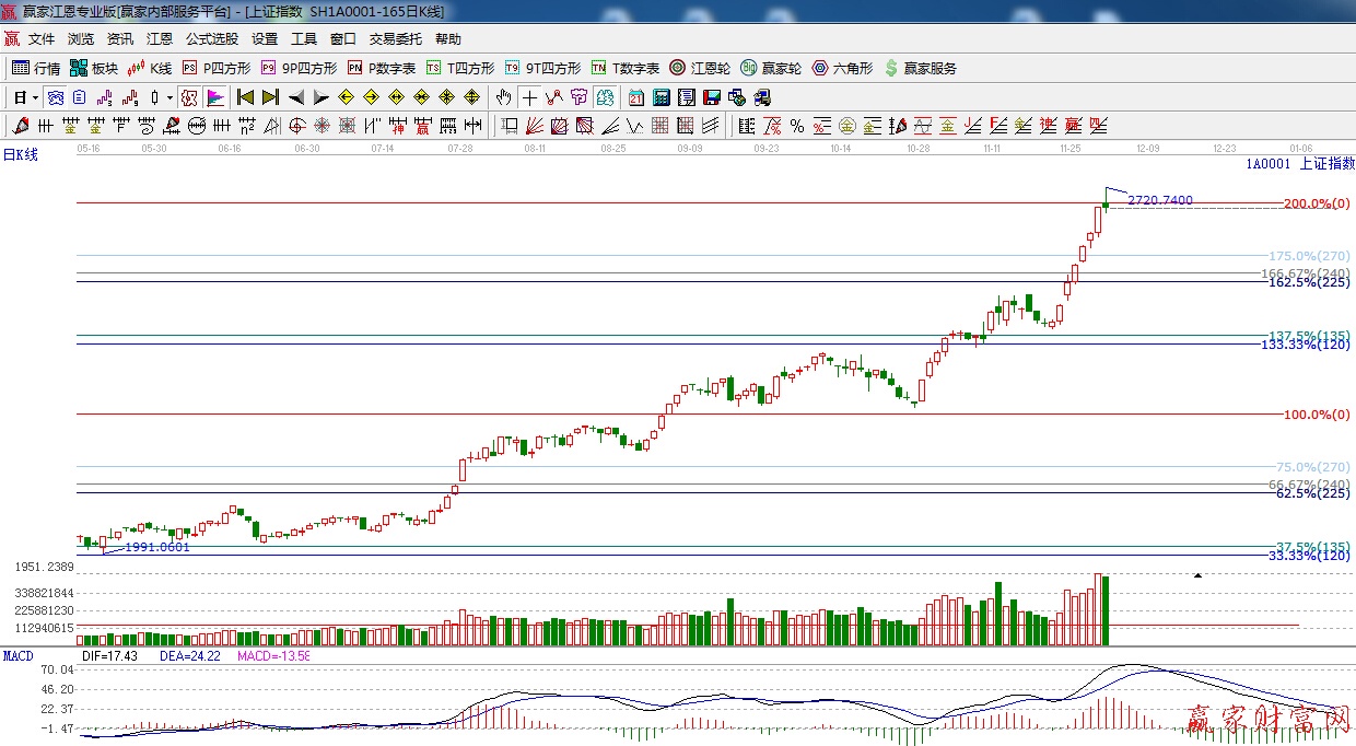 江恩看盤綜述:依據(jù)贏家江恩技術(shù)工具分析得出:上證在200%位置沖高回落,陰十字星報(bào)收,量能依然保持高水平,明日關(guān)注200%,2692點(diǎn)的爭(zhēng)奪,線上看多,線下看空,預(yù)計(jì)本周指數(shù)整體以高位震蕩為主,操作上,一線藍(lán)籌切莫追漲,可適當(dāng)關(guān)注低位具有估值優(yōu)勢(shì)的板塊和個(gè)股