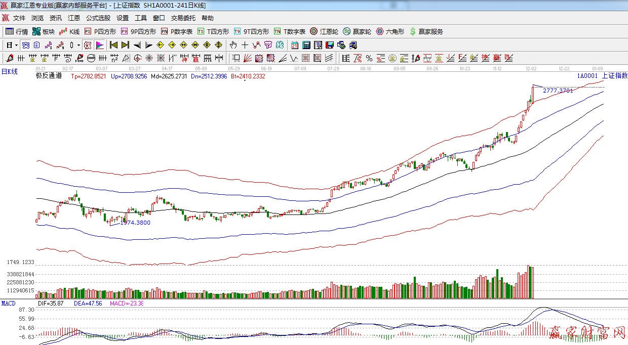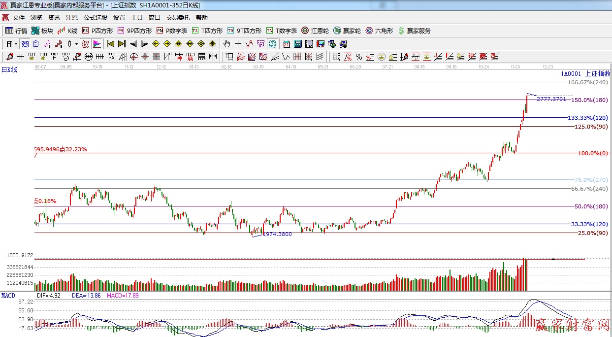 江恩看盤綜述:依據(jù)贏家江恩技術(shù)工具分析得出:市場(chǎng)自12月24日窗口降息以來(lái),在金融權(quán)重的帶動(dòng)下強(qiáng)勢(shì)上攻,今日強(qiáng)勢(shì)突破江恩180度2743點(diǎn),此位置轉(zhuǎn)換為支撐,明日此位置回踩不破,下一目標(biāo)位將是240度位置2842點(diǎn),操作上,可適當(dāng)逢低關(guān)注空氣治理、污水處理等概念股,尤其是具備高送轉(zhuǎn)預(yù)期的個(gè)股。