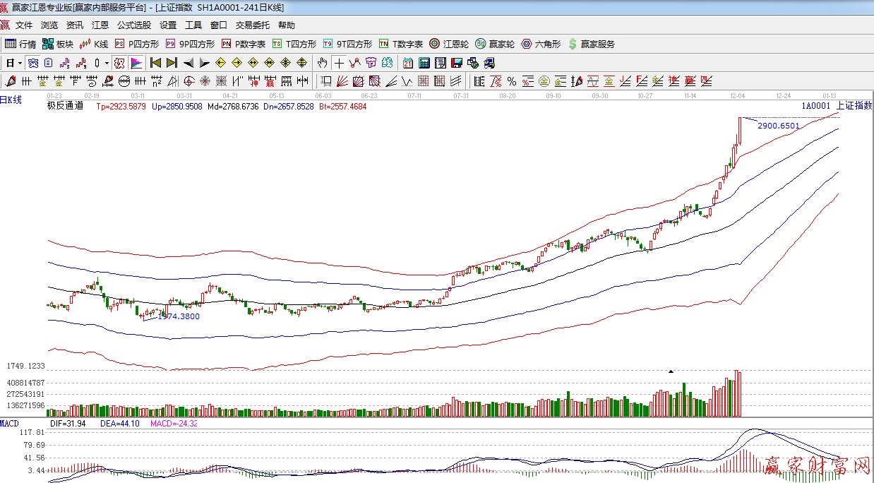 極反通道提示:處于紅色外軌線之外,延續(xù)強勢上攻趨勢,看多。