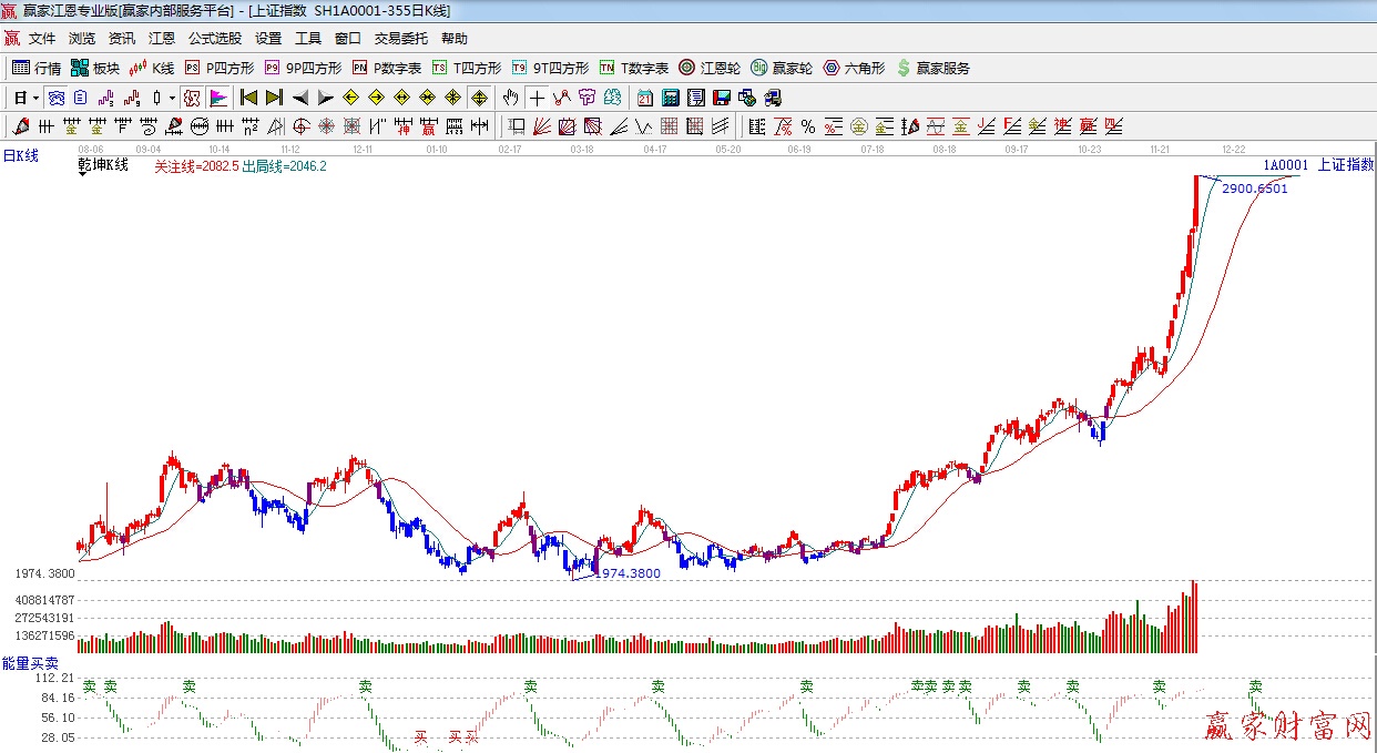 ★依據(jù)贏家江恩系統(tǒng)乾坤K線提示:紅色區(qū)域,短線出局線之上,看多。