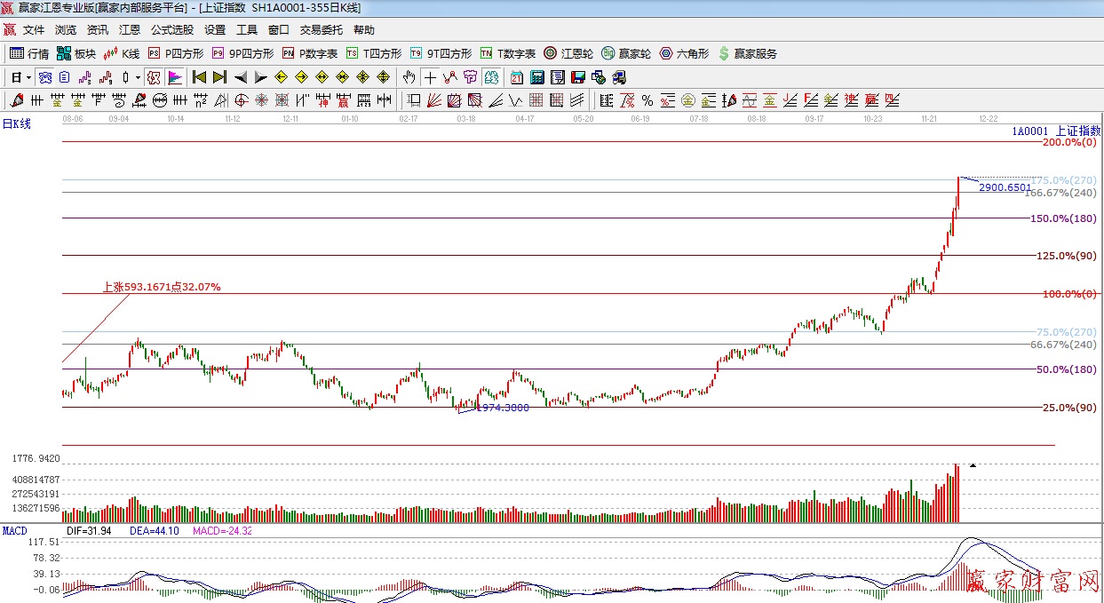 ★依據(jù)贏家江恩系統(tǒng)波段百分比提示:延續(xù)強勢,突破江恩240度2836點,轉(zhuǎn)變?yōu)橹?,上?度位置3034點,