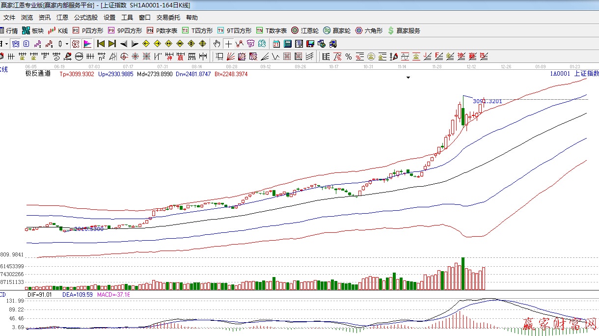 極反通道提示:指數(shù)沿紅色外軌線,繼續(xù)震蕩走高,依據(jù)規(guī)則外軌線不破,整體看多趨勢不變。