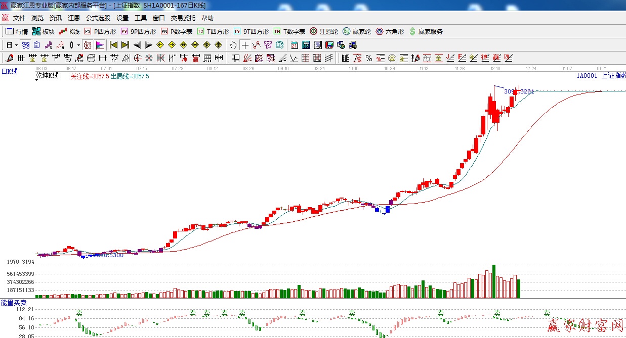 ★依據(jù)贏家江恩系統(tǒng)乾坤K線提示:紅色區(qū)域,綠色出局線之上,趨勢看多