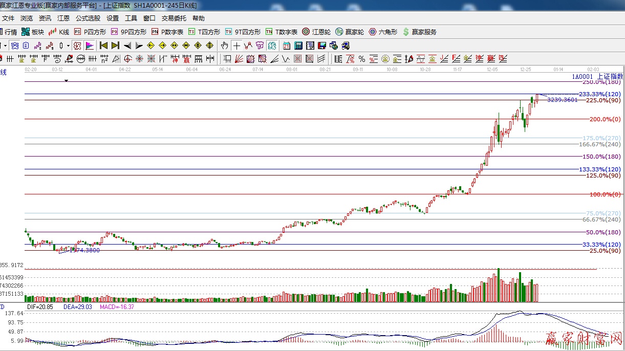 ☆依據贏家江恩系統(tǒng)波段百分比提示:下方支撐3186點,上方江恩120度3251點阻力。