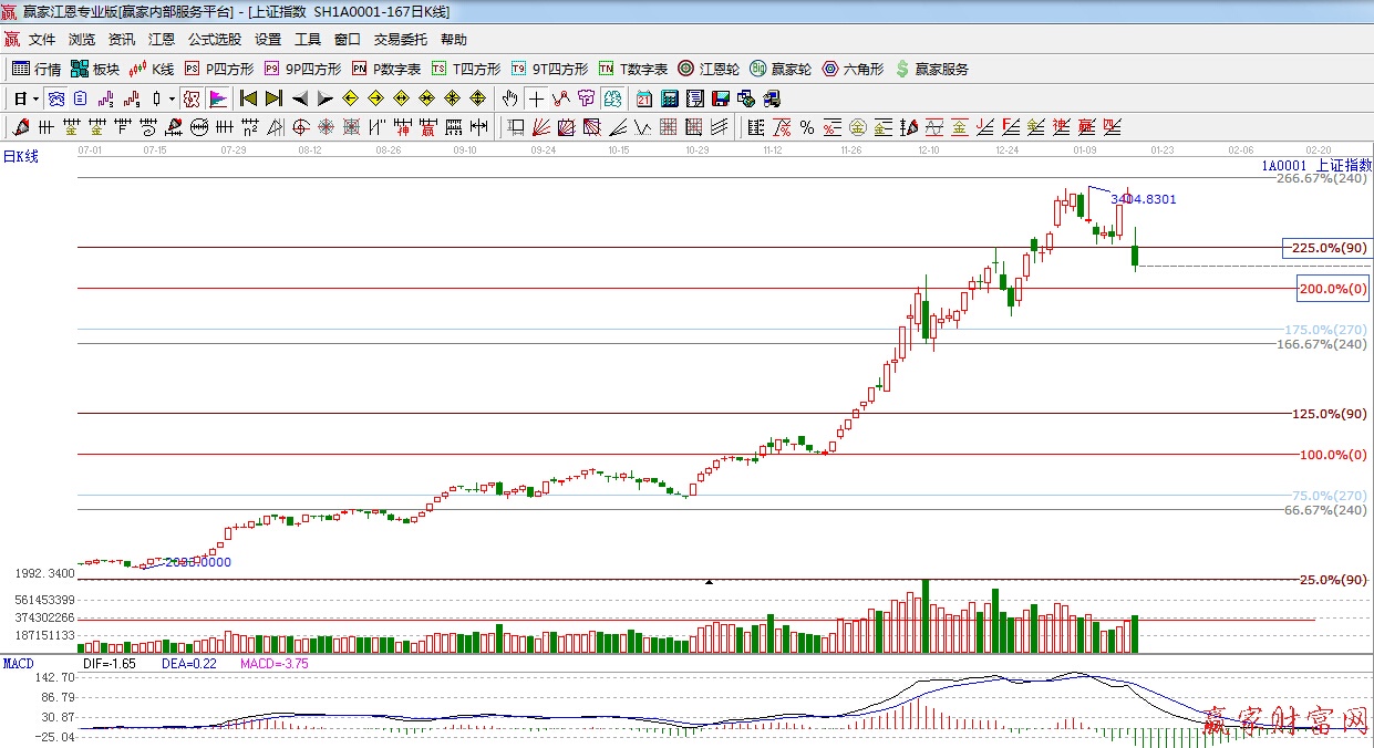 江恩看盤綜述:依據(jù)贏家江恩技術(shù)工具分析得出:今日盤面上的重挫是市場強(qiáng)勢上漲過程中的震蕩,需冷靜面對,按照江恩百分比分析:滬指盤中破位江恩90度3188點(diǎn),下方下一支撐位是江恩0度位置3039點(diǎn)附近,加之明天是節(jié)氣“大寒”的時間窗口,滬指將會在江恩0度支撐附近止跌回穩(wěn),然后重新步入強(qiáng)勢格局,但券商等權(quán)重股走勢或?qū)焊嬉欢温?,指?shù)后期將轉(zhuǎn)入震蕩上行的慢牛格局。市場熱點(diǎn)也將會轉(zhuǎn)入中小盤。