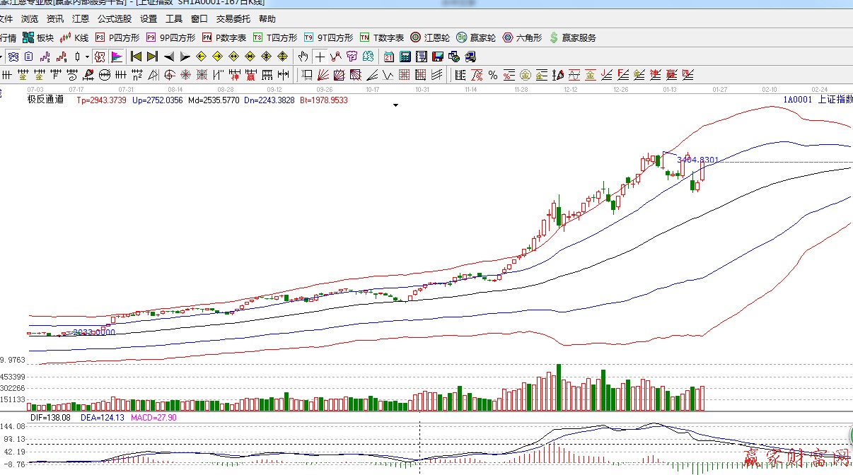 極反通道提示:滬指高開高走延續(xù)反彈,突破藍(lán)色外軌線,再次進(jìn)入超強(qiáng)通道,看多。