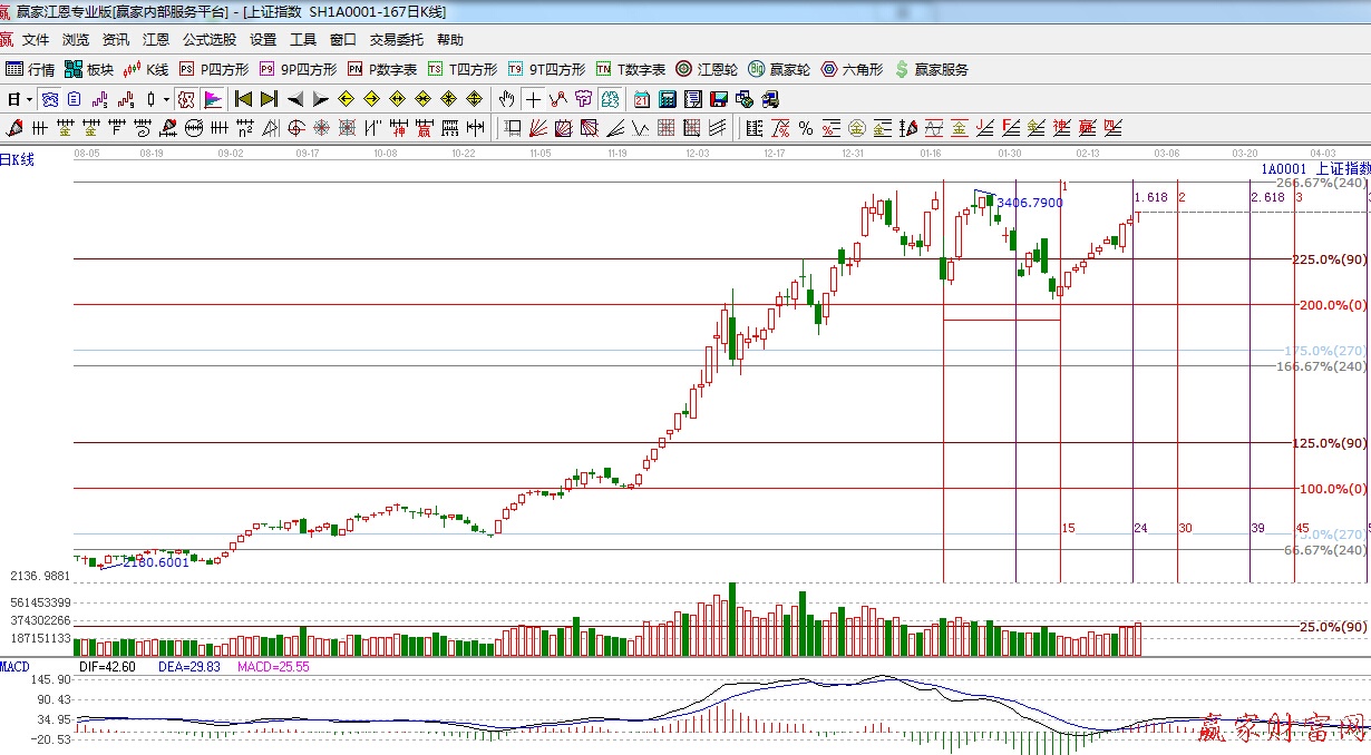 ★依據(jù)贏家江恩理論系統(tǒng)波段百分比提示:短期上方阻力位是江恩百分比240度,3436點,270度,3486點,支撐90度3188點。