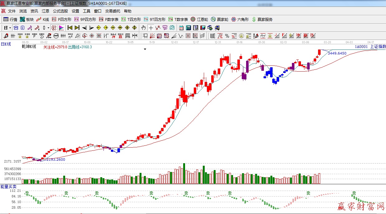 ★依據(jù)贏家江恩理論系統(tǒng)乾坤K線提示:紅色k線,短線出局線之上,紅色關(guān)注線之上,趨勢看多。