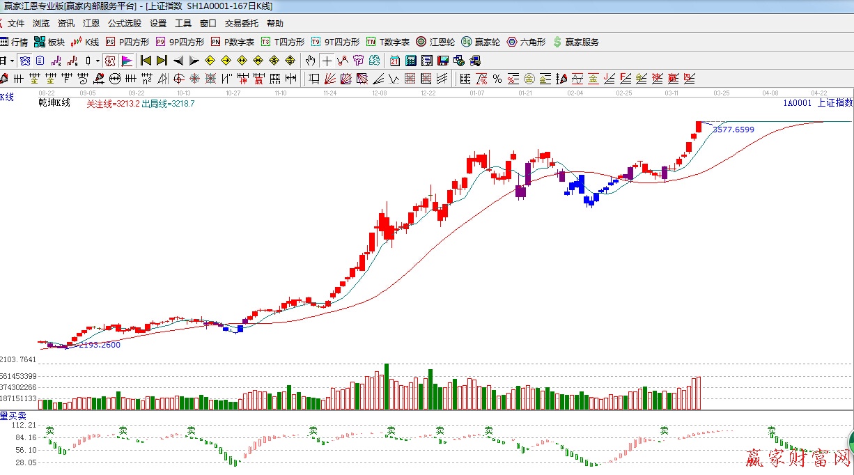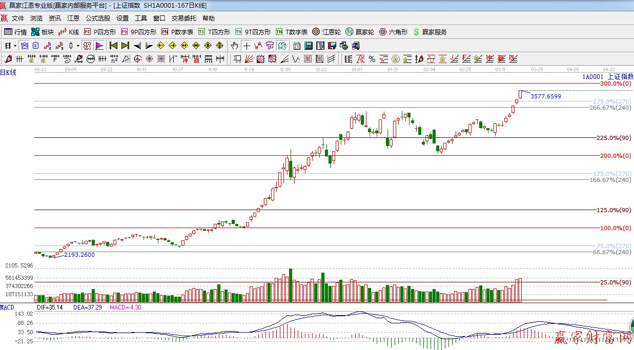 ★依據(jù)贏家江恩理論系統(tǒng)波段百分比提示:下一目標(biāo)是江恩0度位置,3635點(diǎn)。