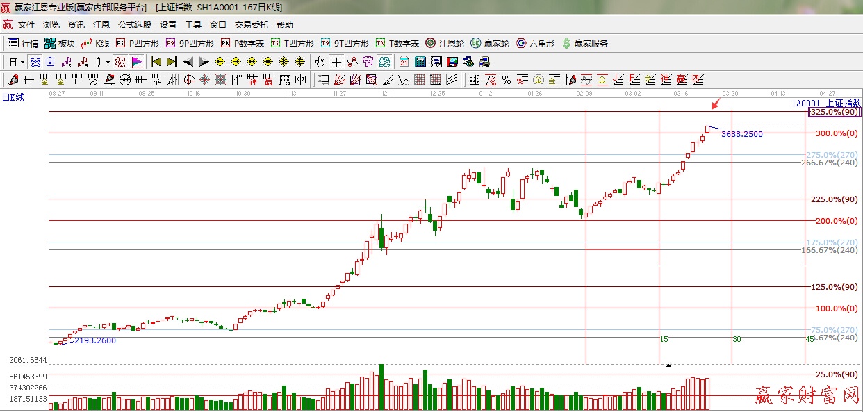 ★依據(jù)贏家江恩理論系統(tǒng)波段百分比提示:跳空突破江恩0度位置,0度位置3655點(diǎn)轉(zhuǎn)換為支撐,上方下一個阻力將是江恩90度位置3783點(diǎn)附近。