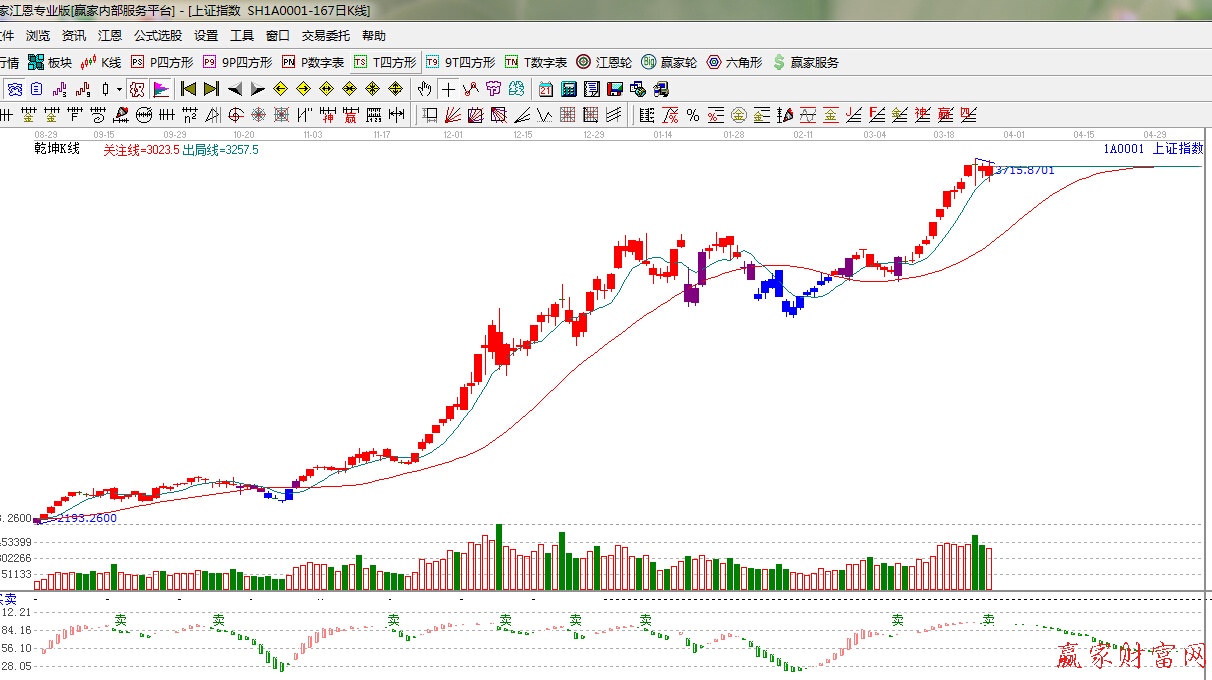 ★依據(jù)贏家江恩理論系統(tǒng)乾坤K線提示:紅色k線,關(guān)注綠色關(guān)注線的得失,