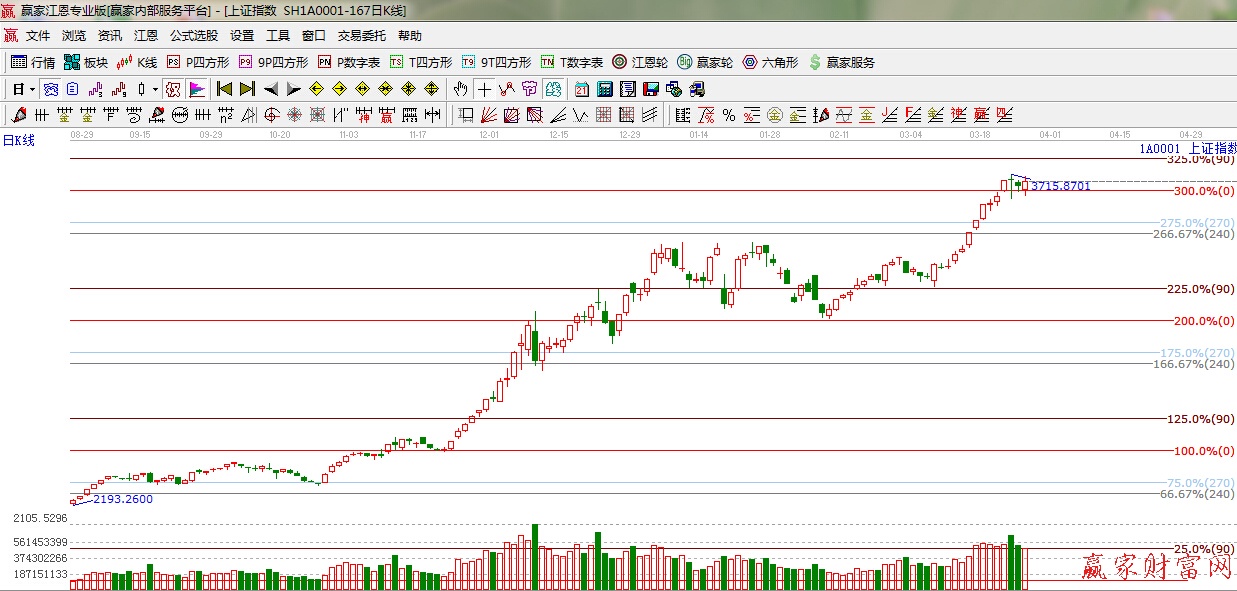 江恩看盤綜述:依據(jù)贏家江恩技術(shù)工具分析得出:今日早盤再次上攻3700,隨后震蕩小幅回落,上攻動(dòng)能稍顯乏力。創(chuàng)業(yè)板指全天大幅下挫近4%,盤面上,醫(yī)藥、白酒等防御性板塊都在大盤震蕩過程中獲得了不錯(cuò)的補(bǔ)漲機(jī)會(huì),這也從一個(gè)側(cè)面顯示了當(dāng)前市場存在的調(diào)整壓力,雖說大的趨勢依然向上,但短期的調(diào)整也需謹(jǐn)慎對待。操作上,關(guān)注滯漲品種以及年報(bào)超預(yù)期的個(gè)股。