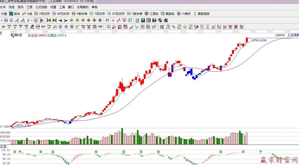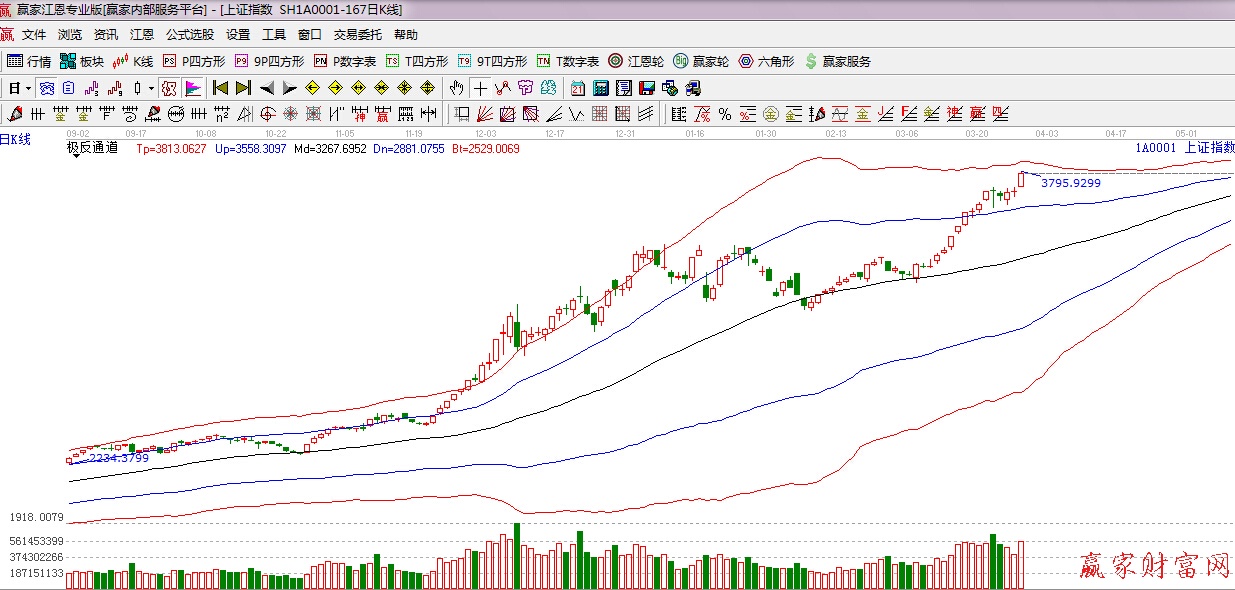 江恩看盤(pán)綜述:依據(jù)贏家江恩技術(shù)工具分析得出:近期指數(shù)圍繞江恩0度位置整理,30日是前期提到的時(shí)間窗口,滬指如期再次走強(qiáng),向上攻擊并突破江恩90度位置3783點(diǎn),創(chuàng)7年新高,總體來(lái)看,市場(chǎng)整體強(qiáng)勢(shì)不改,依據(jù)工具分析,由于上行靠近極反通道紅色外軌阻力線,后期繼續(xù)上行可逐步控制倉(cāng)位。操作上,繼續(xù)布局滯漲品種以及年報(bào)超預(yù)期的個(gè)股,對(duì)于短線急漲的個(gè)股要控制好倉(cāng)位。