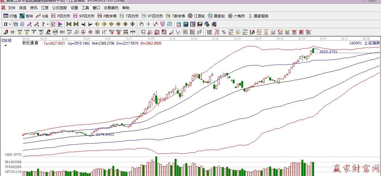 極反通道提示:在利好推動下,滬指大幅高開,但上方面臨紅色外軌線阻力,隨著權(quán)重板塊的沖高,股指也逐步回落,短期謹(jǐn)慎看多。
