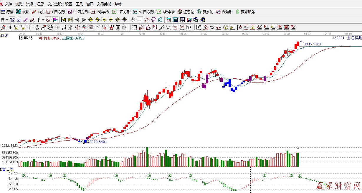 ★依據(jù)贏家江恩理論系統(tǒng)乾坤K線提示:紅色k線,綠色線上方,留意綠色短線出局線得失。