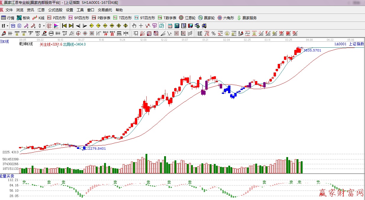 ★依據(jù)贏家江恩理論系統(tǒng)乾坤K線提示:紅色k線,綠色線上方,留意綠色短線出局線得失。