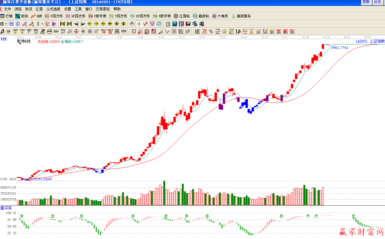 ★依據(jù)贏家江恩理論系統(tǒng)乾坤K線提示:紅色k線,綠色線上方,留意綠色短線出局線,綠色線不破,繼續(xù)看多。