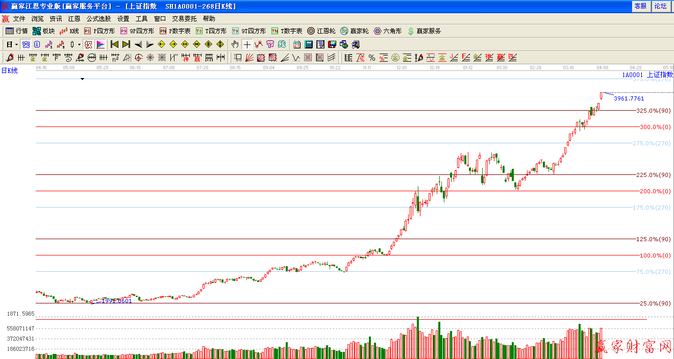 ★依據(jù)贏家江恩理論系統(tǒng)波段百分比提示:上一交易日滬指回踩江恩90度3783點(diǎn)附近,繼續(xù)震蕩攀升,今日繼續(xù)跳空強(qiáng)勢(shì)走高,依據(jù)規(guī)則下一目標(biāo)位是江恩270度4081點(diǎn)。