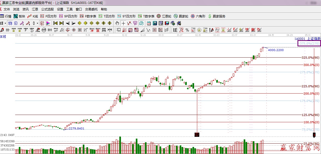 ★依據(jù)贏家江恩理論系統(tǒng)波段百分比提示:依據(jù)規(guī)則下一目標(biāo)位是江恩270度4081點。