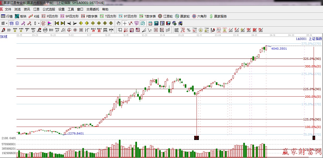 ★依據(jù)贏家江恩理論系統(tǒng)波段百分比提示:依據(jù)規(guī)則下一目標位是江恩270度4081點,下方支撐江恩90度是3783點。