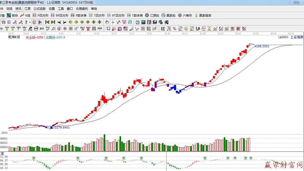 ★依據(jù)贏家江恩理論系統(tǒng)波段百分比提示:今日滬深兩市跳空突破江恩120度4082點(diǎn),下一目標(biāo)位是135度4157點(diǎn)附近。