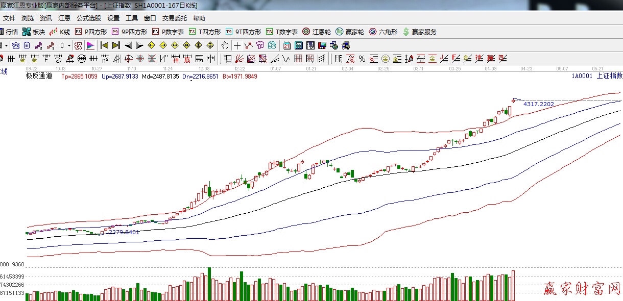 極反通道提示:極反通道紅色外軌線支撐上方,延續(xù)強(qiáng)勢,短期繼續(xù)謹(jǐn)慎看多。