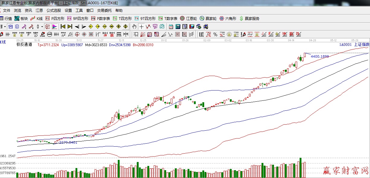 極反通道提示:紅色外軌超強區(qū)域,趨勢強勢,看多。