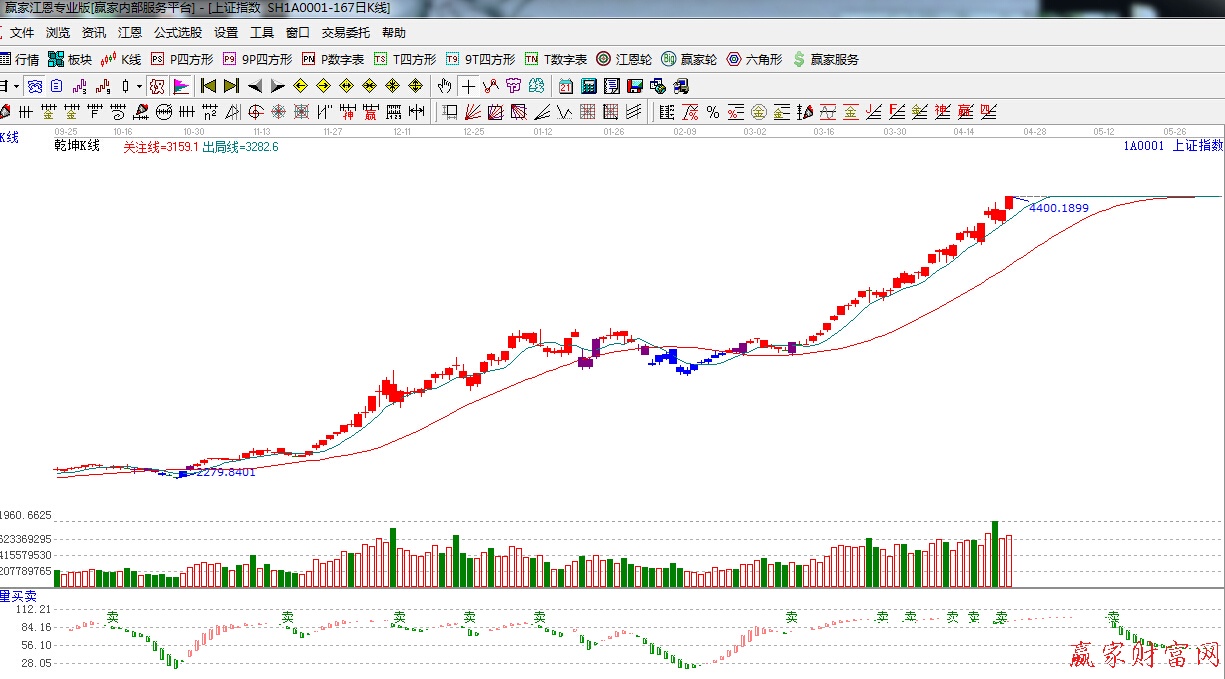 ☆依據(jù)贏家江恩理論系統(tǒng)能量買賣提示:有“賣”字出現(xiàn),指標鈍化,謹慎看多。