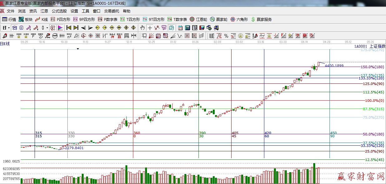 ★依據(jù)贏家江恩理論系統(tǒng)波段百分比提示:江恩百分比180度4300點附近支撐線,此位置不破整體趨勢不變,上方下一目標位是270度,4700點附近。